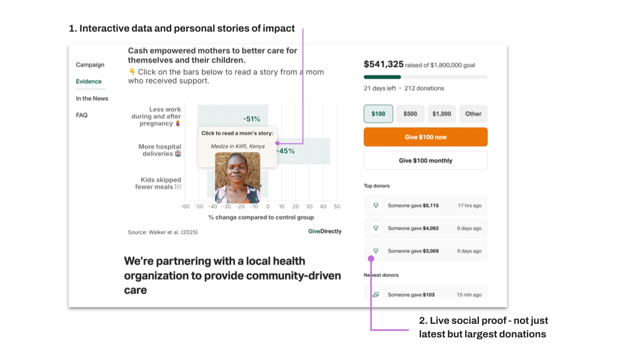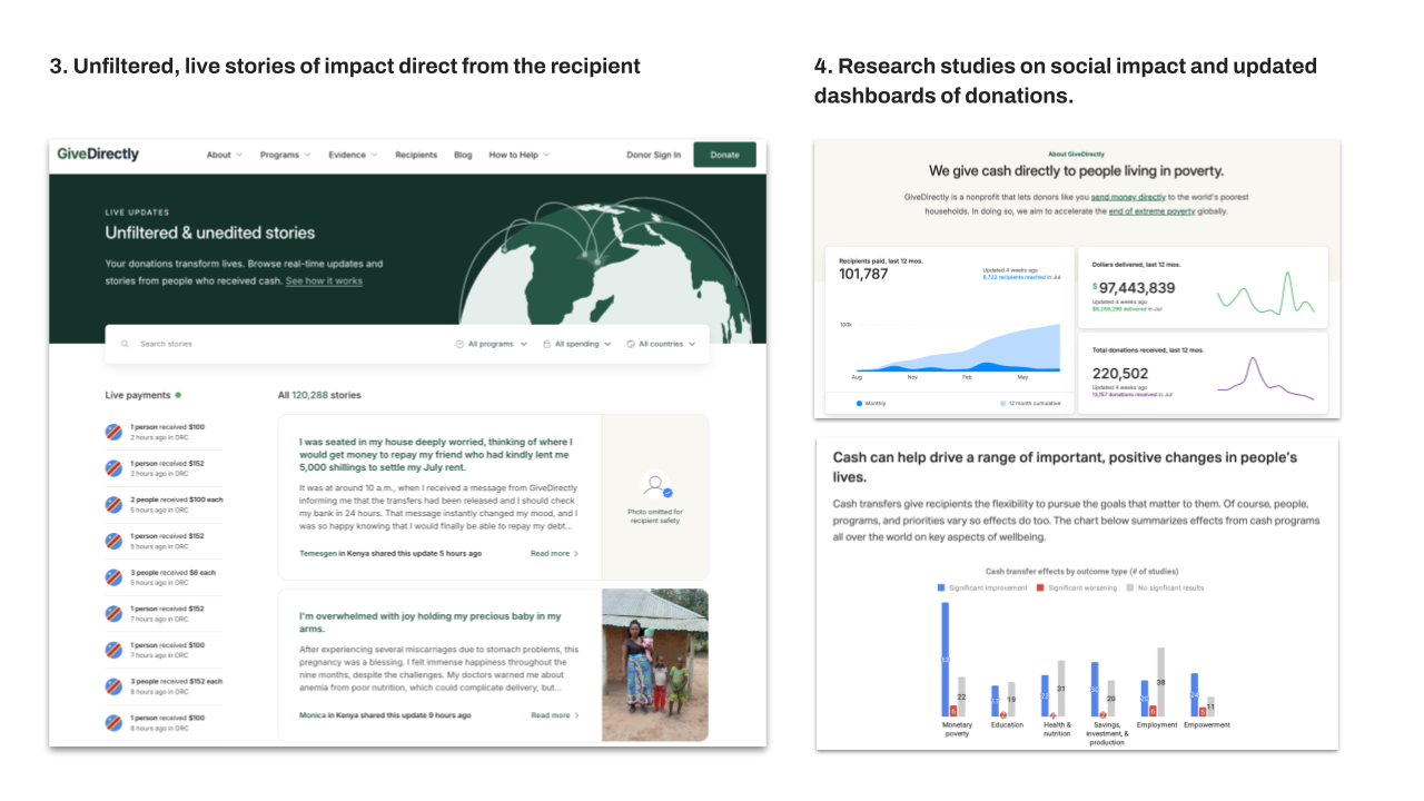 For example: GiveDirectly uses live updates, dashboards, and recipient stories to build trust with donors.